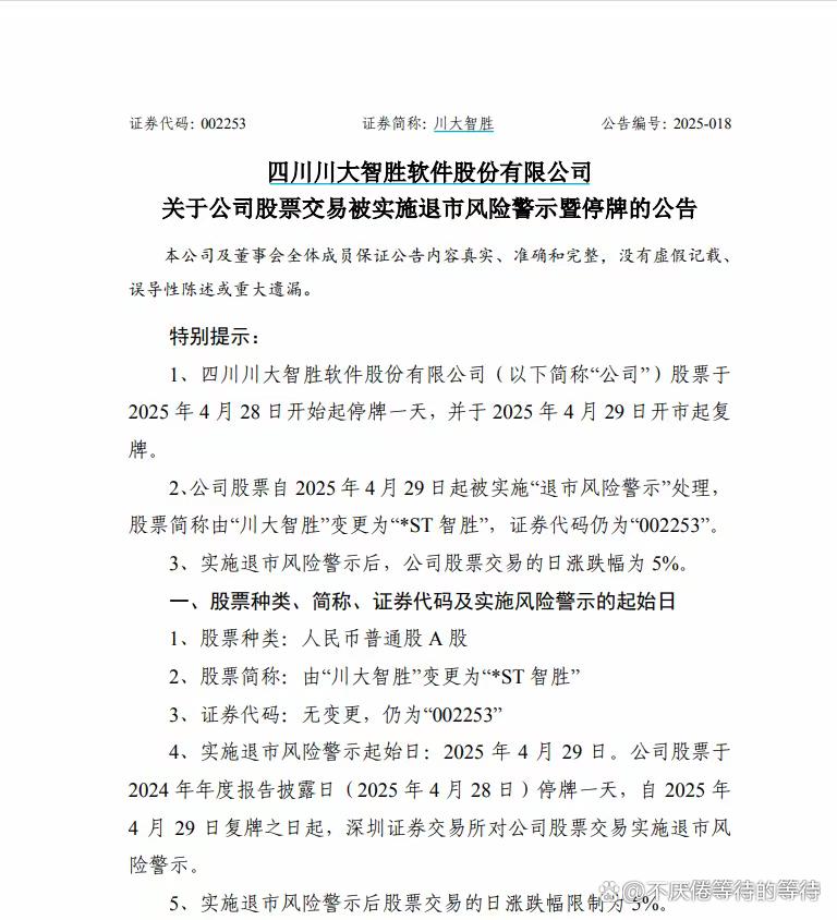 4月27日晚间,川大智胜(002253.SZ)发布公告称,公司股票将于4月28日停牌一天,并于4月29日起复牌并被实施退市风险警示,股票简称变更为“*ST智胜”。这一决定源于公司2024年度财务指标触及深交所相关退市规定,标志着这家曾因"特朗普概念"被市场热炒的企业正式步入风险警示阶段。本文将深入分析川大智胜被实施退市风险警示的具体原因、公司近年来的经营困境、市场反应以及未来可能的发展路径配资策略网,为投资者提供全面客观的参考。